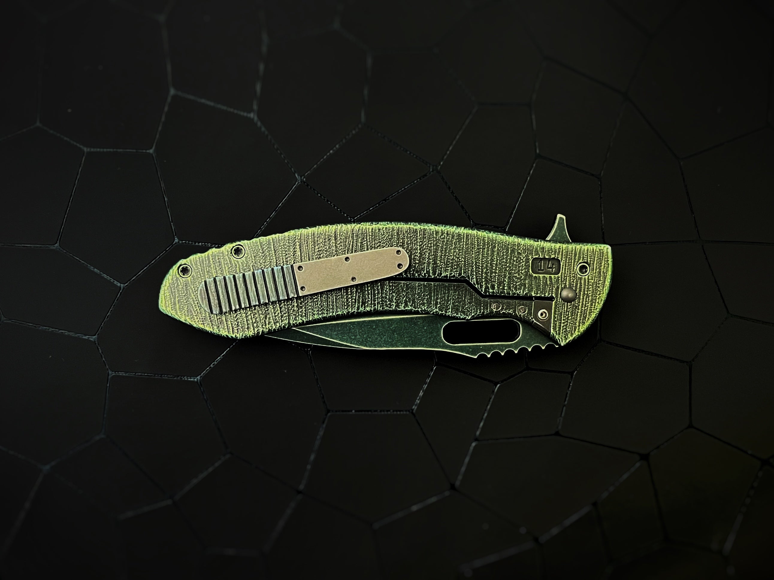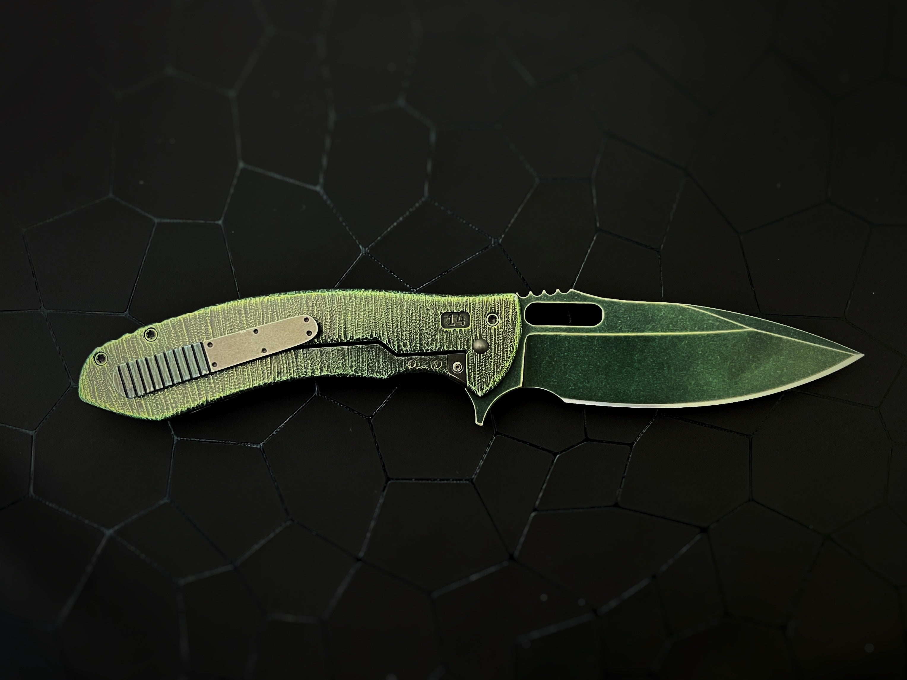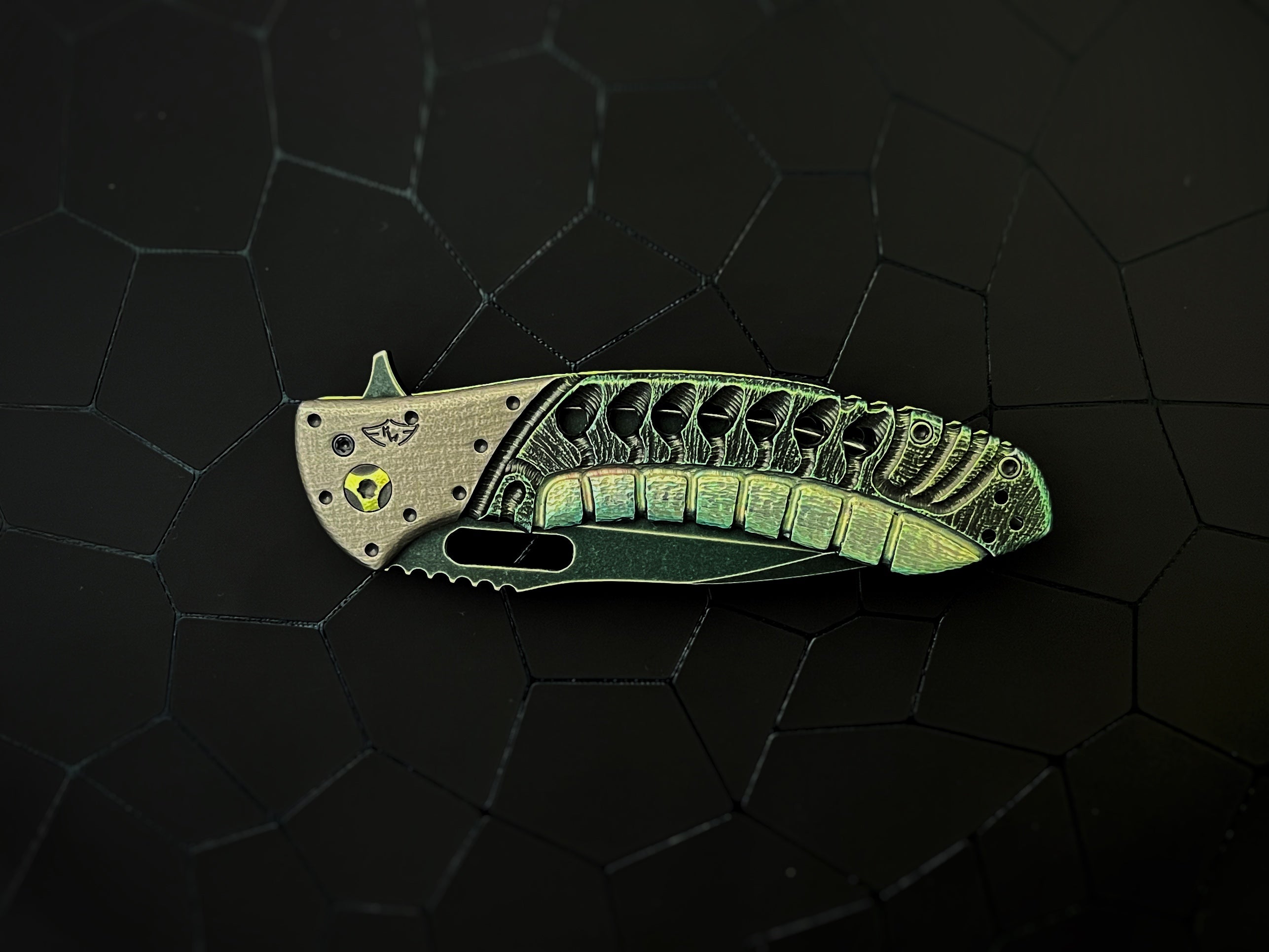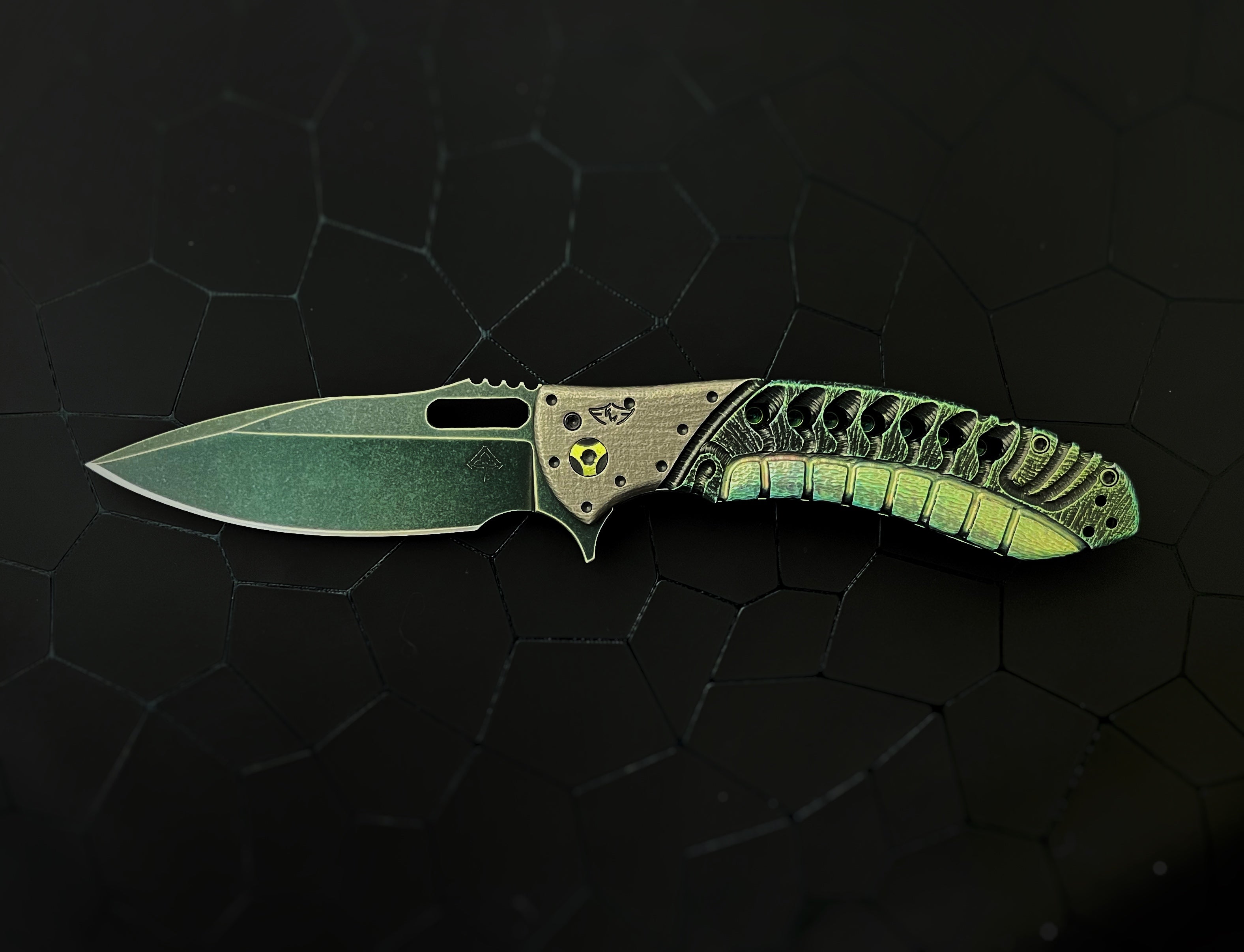 Way back in the day, a decade ago, actually, we did a little collaboration run of 30 knives with our friend Eric Kramer of Kramer Knives. Did we come up with this idea around a bonfire drinking bourbon? Absolutely! This particular Deity is the only one of 30 that got carve work. Now this was a decade ago so it's not quite a detailed and crazy as I do these days, but it is still a stunner.