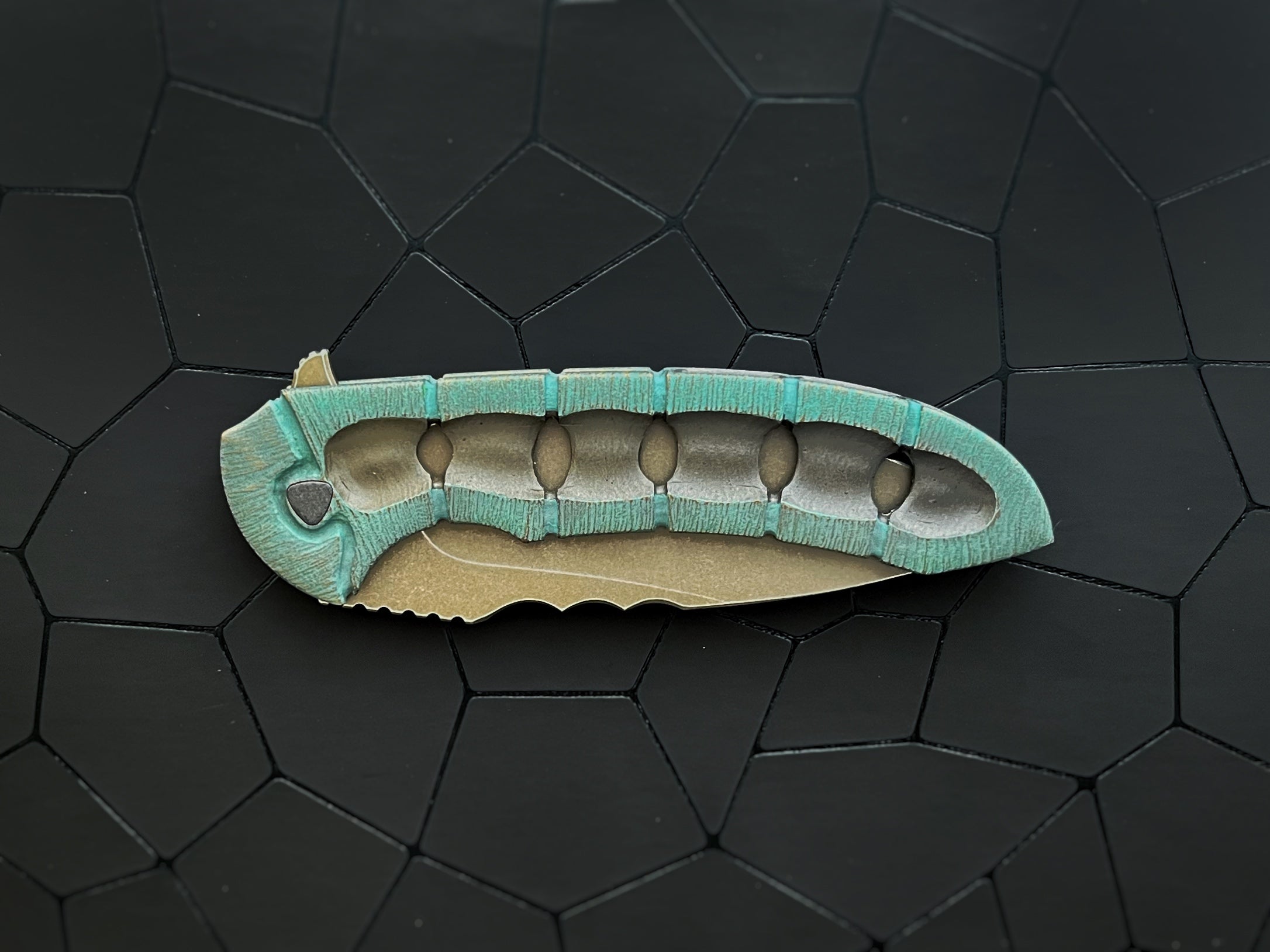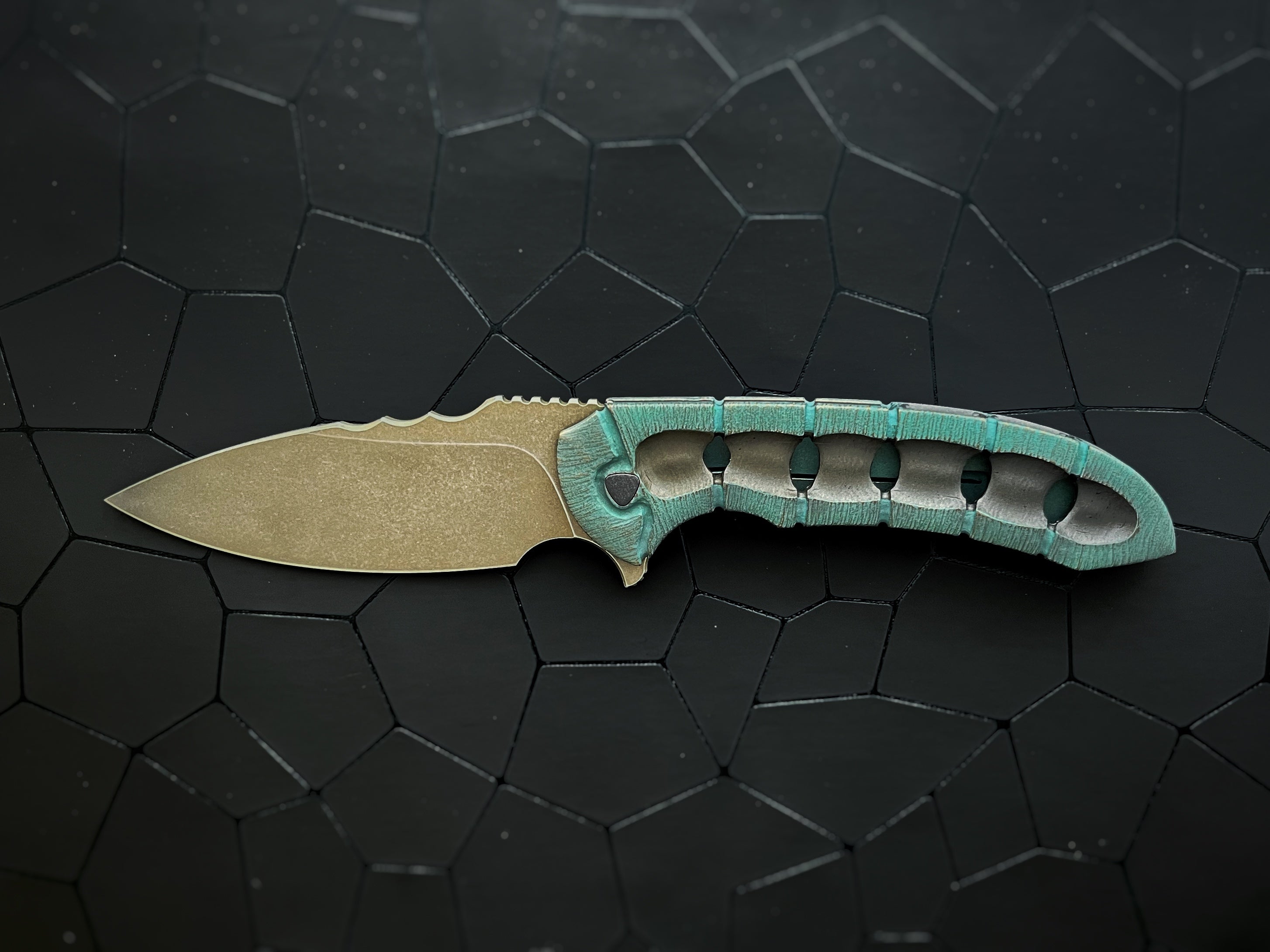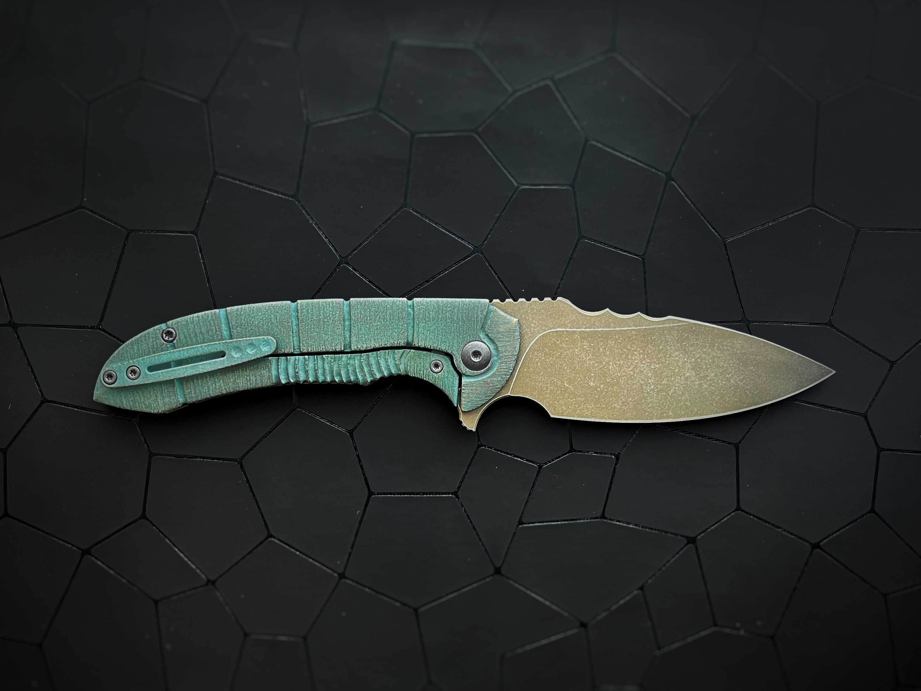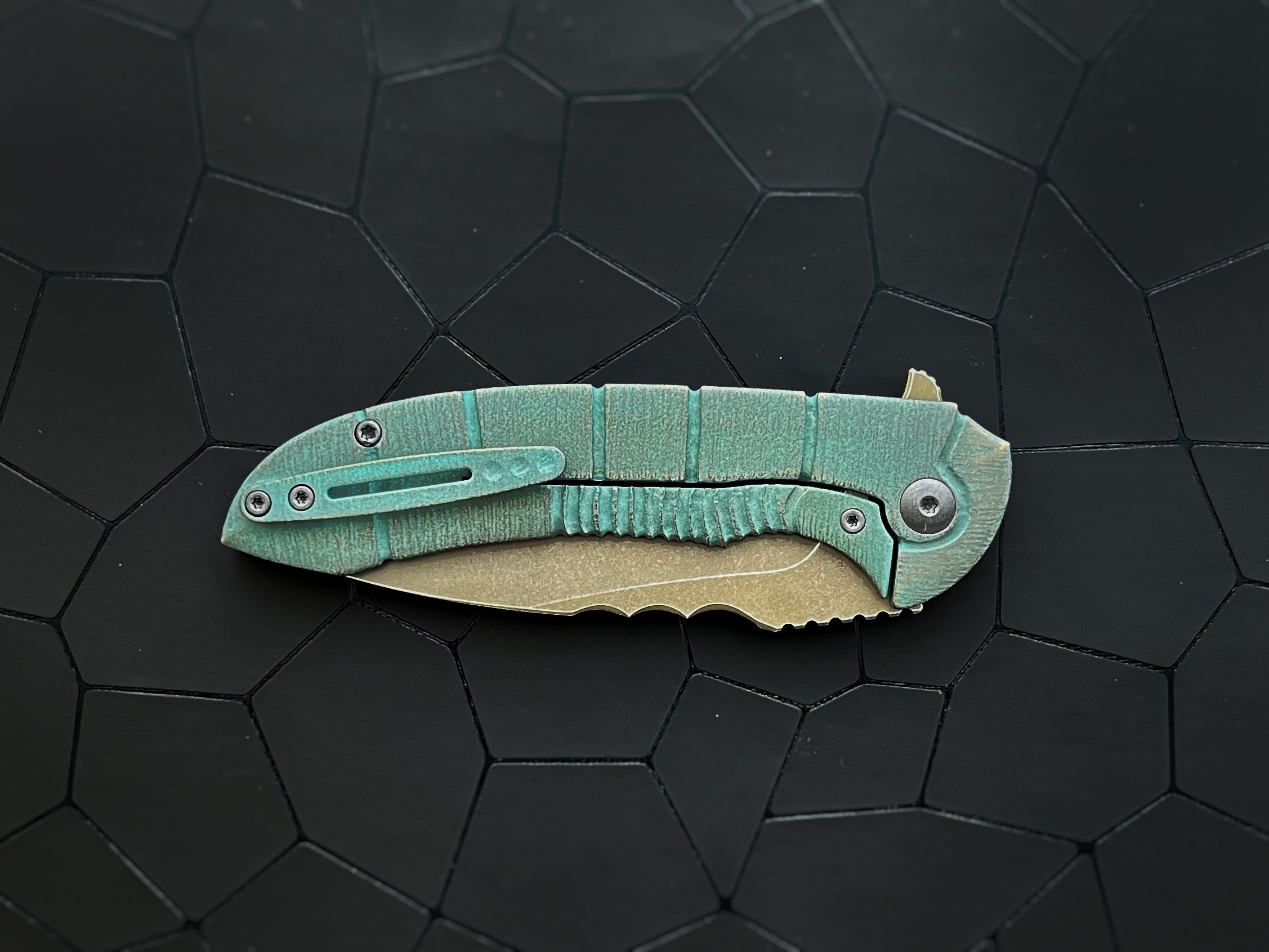 It features fully carved titanium scales and pocket clip, nano ceramic coating and advanced anodizing, and a faux aged copper blade finish.